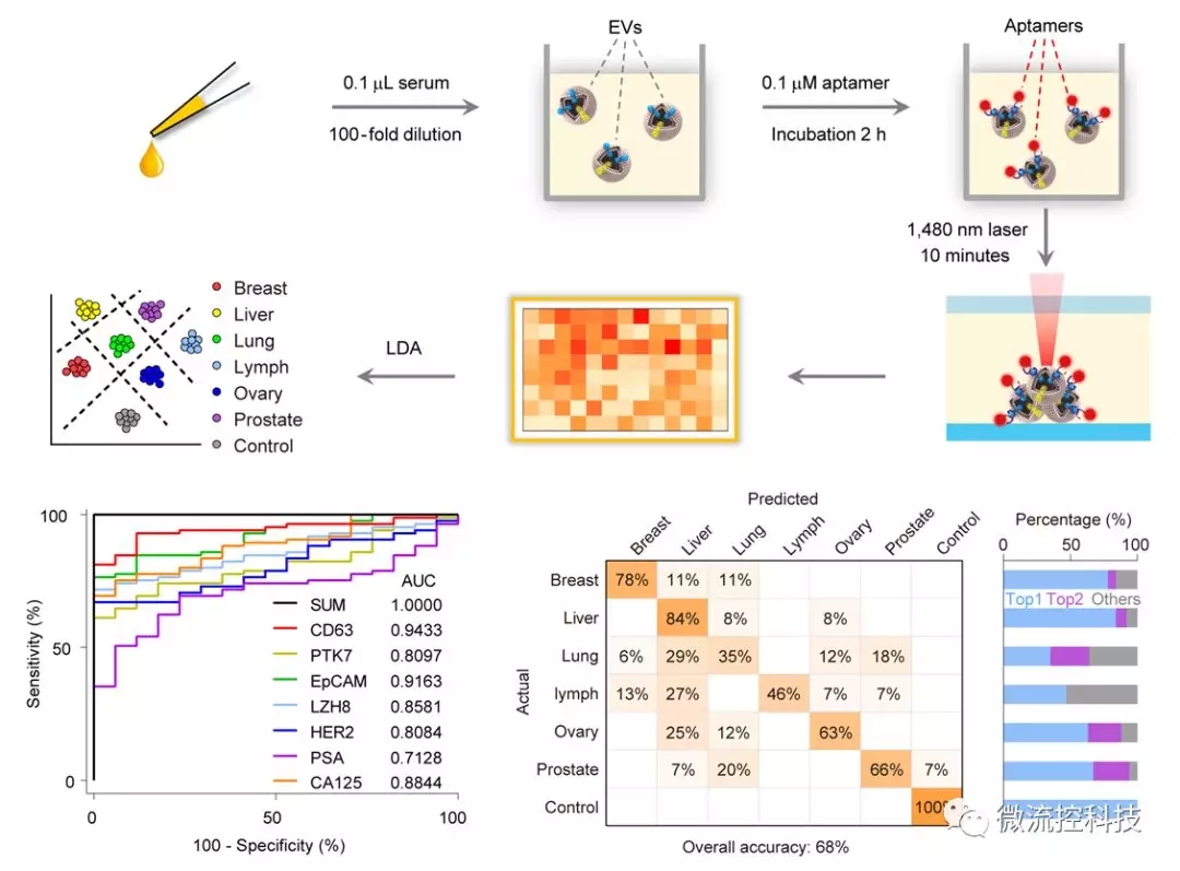 作為腫瘤液體活檢標(biāo)志物的研究熱點(diǎn),腫瘤細(xì)胞外囊泡EV是由腫瘤細(xì)胞分泌的具有磷脂雙分子層結(jié)構(gòu)的囊泡狀小體,主要包括外泌體(30-150 nm)和微囊泡(200-1000 nm)。EV通過(guò)攜帶母細(xì)胞的蛋白、DNA、RNA等生物大分子,直接或間接調(diào)控受體細(xì)胞的功能和表型,參與細(xì)胞病理生理學(xué)過(guò)程。腫瘤細(xì)胞外囊泡EV在外周血中含量高,結(jié)構(gòu)穩(wěn)定,可以覆蓋腫瘤異質(zhì)性。然而,如何在高背景血清或血漿樣本中分離提取尺寸較小的EV,如何提高EV檢測(cè)方法的靈敏度,是現(xiàn)有EV腫瘤液體活檢面臨的重大挑戰(zhàn)。孫佳姝課題組創(chuàng)新性利用微流控?zé)嵊靖患昂怂徇m體識(shí)別技術(shù),無(wú)需EV分離提取等操作,在1μL 血清或血漿樣本中實(shí)現(xiàn)7種EV膜蛋白的高靈敏、定量、快速、低成本檢測(cè)。研究人員首先利用熒光標(biāo)記的核酸適體特異性識(shí)別EV表面腫瘤相關(guān)膜蛋白;其次通過(guò)激光照射微流控芯片產(chǎn)生溫度梯度誘導(dǎo)的熱泳,使30-1000 nm的EV快速匯聚至芯片******(富集倍數(shù)1400),而游離的核酸適體或蛋白仍保持分散狀態(tài);EV匯聚后,使用熒光顯微鏡讀取結(jié)合在EV上的核酸適體信號(hào),獲得EV膜蛋白組學(xué)信息;最后結(jié)合機(jī)器學(xué)習(xí)算法,將EV膜蛋白組學(xué)信息用于6種癌癥的早期自動(dòng)分型檢測(cè)、前列腺腫瘤液體活檢及前列腺癌的復(fù)發(fā)監(jiān)控。