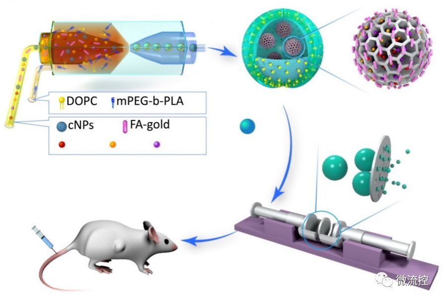 科研人員提出微流體雙乳體系,從而非常高效的實現封裝多種疏水性及親水性物質。介孔硅納米粒子有非常好的生物相容性、生物可降解性、高載藥率及表面可功能化修飾等特點。而金納米粒子在生物成像及光熱治療方面被廣泛應用。在該項目中,該研究團隊首先把金納米棒通過化學反應結合在介孔硅表面,然后通過介孔硅裝載大量親水、疏水、蛋白及核酸藥物,并通過微流體雙乳法一步將介孔硅包裹在了以高分子為主體,同時復合磷脂的巨型囊泡中。隨后,基于過膜擠壓的調控,構建出了多藥物同時負載的納米載藥粒子。