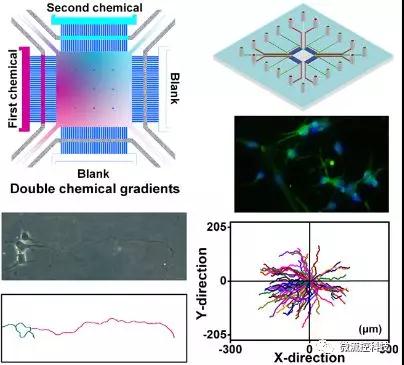 中南大學(xué)劉文明課題組和西北農(nóng)林科技大學(xué)王進(jìn)義課題組針對(duì)這一問(wèn)題,采用微流控芯片技術(shù),并通過(guò)在特定微管道內(nèi)引入水凝膠材料,成功實(shí)現(xiàn)了不同生化分子在不同方向濃度梯度發(fā)生的微尺度、時(shí)間與空間控制,驗(yàn)證了多向水凝膠屏障可滿足芯片內(nèi)快捷、穩(wěn)定、長(zhǎng)時(shí)間的單一線性和雙輻射化學(xué)濃度梯度的無(wú)剪切力發(fā)生;進(jìn)一步,基于微流控精確流體操作,完成了芯片內(nèi)的鼠原代皮質(zhì)神經(jīng)元培養(yǎng),并使其保持高活性、代表性神經(jīng)元表型和神經(jīng)突起生長(zhǎng)及延伸;重要的是,通過(guò)實(shí)驗(yàn)研究證實(shí)了該芯片模型可用于神經(jīng)導(dǎo)向吸引與排斥因子梯度共存微環(huán)境下的軸突導(dǎo)向研究。該研究建立的微流控多梯度芯片為探究神經(jīng)發(fā)生、發(fā)展及再生提供了一很好的微尺度操作與分析原型平臺(tái)。研究者認(rèn)為,這一方法學(xué)進(jìn)展有助于優(yōu)化設(shè)計(jì)和仿生構(gòu)建可時(shí)空控制的多重濃度梯度組織微環(huán)境系統(tǒng),在神經(jīng)生物學(xué)、腫瘤學(xué)、炎癥、及******醫(yī)療等領(lǐng)域均具有重要的應(yīng)用研究潛力。